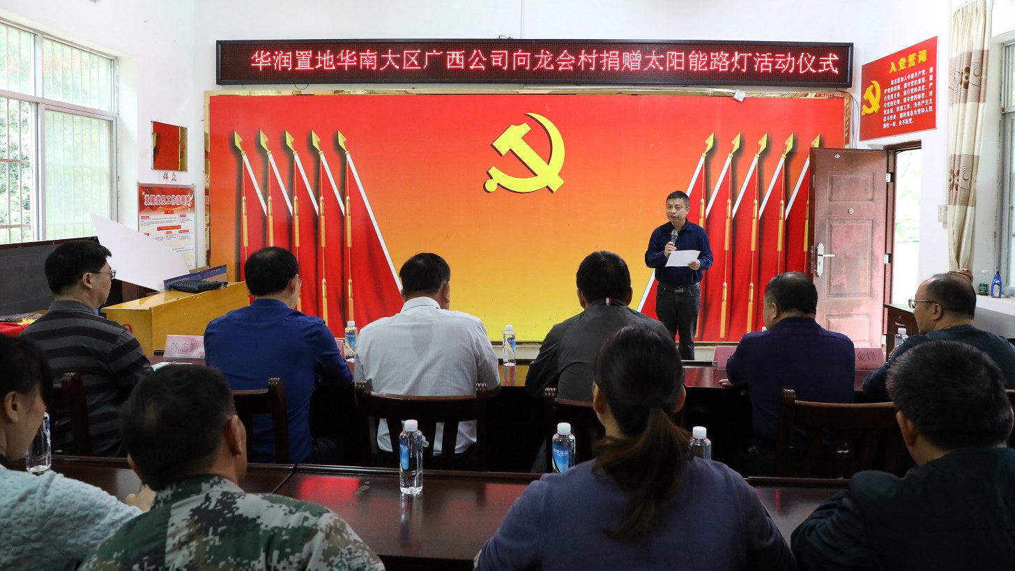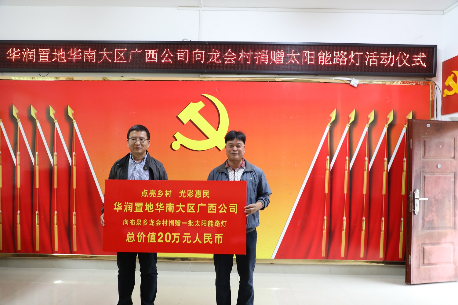 10月14日,南寧市自然資源局?jǐn)y愛心企業(yè)華潤置地華南大區(qū)廣西公司到我院結(jié)對幫扶貧困村布泉鄉(xiāng)龍會村開展扶貧捐贈活動,向龍會村捐贈一批價值20萬元的太陽能路燈,助力鄉(xiāng)村振興。