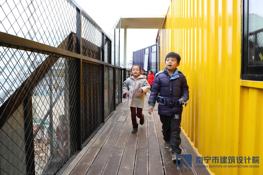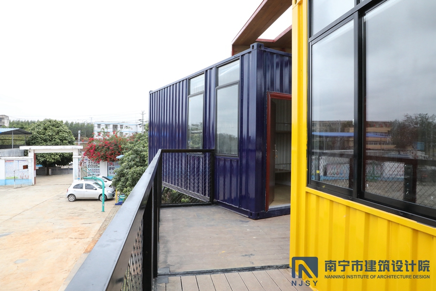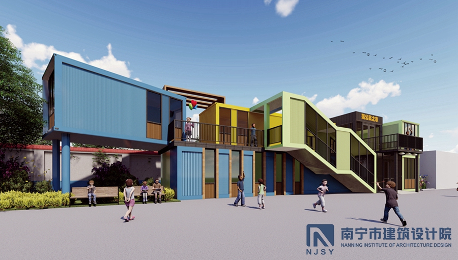 項(xiàng)目采用了集裝箱房屋的形式,由10個集裝箱構(gòu)成,通過堆積木的形式,根據(jù)學(xué)生兒童所需的建筑風(fēng)格和功能需求,將集裝箱橫豎排列,形成一定的退臺和露臺空間,為孩子們提供更多共享活動空間。