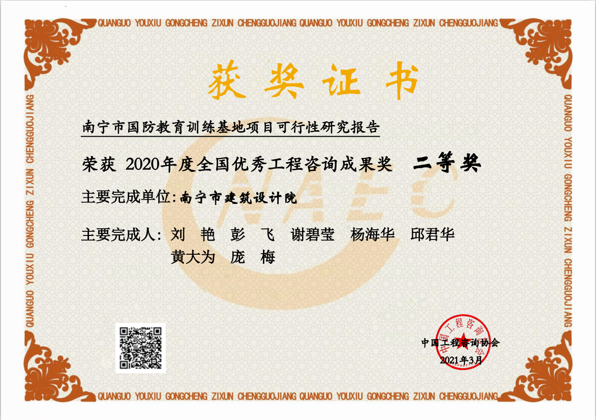3月,中國工程咨詢協(xié)會發(fā)布了2020年度全國優(yōu)秀工程咨詢成果獎,由我公司申報的《南寧市國防教育訓練基地項目可行性研究報告》獲得2020年度全國優(yōu)秀工程咨詢成果獎二等獎。此前,該成果報告還獲得了2020年度廣西優(yōu)秀工程咨詢成果一等等次。