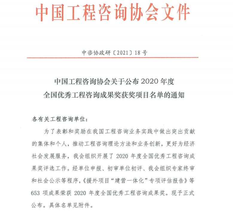 全國優(yōu)秀工程咨詢成果獎是由中國工程咨詢協(xié)會組織評選的工程咨詢行業(yè)權威性全國性獎項,涵蓋規(guī)劃咨詢、項目咨詢、評估咨詢、全過程工程咨詢、政策研究專題報告五部分內容,每兩年評選一次,是我國工程咨詢領域最高獎。