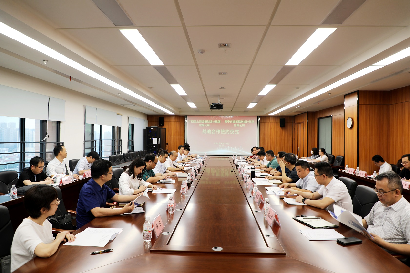 6月28日,南寧市建筑規(guī)劃設(shè)計(jì)集團(tuán)有限公司與廣西國土資源規(guī)劃設(shè)計(jì)集團(tuán)有限公司戰(zhàn)略合作簽約儀式在我集團(tuán)舉行。集團(tuán)黨委書記、董事長韋文學(xué)和廣西國土資源規(guī)劃設(shè)計(jì)集團(tuán)黨委書記、董事長鄧強(qiáng)出席儀式并見證簽約,集團(tuán)總經(jīng)理、副董事長馮江泉和廣西國土資源規(guī)劃設(shè)計(jì)集團(tuán)總經(jīng)理、黨委副書記、副董事長魏玉平分別代表雙方簽訂戰(zhàn)略合作協(xié)議。