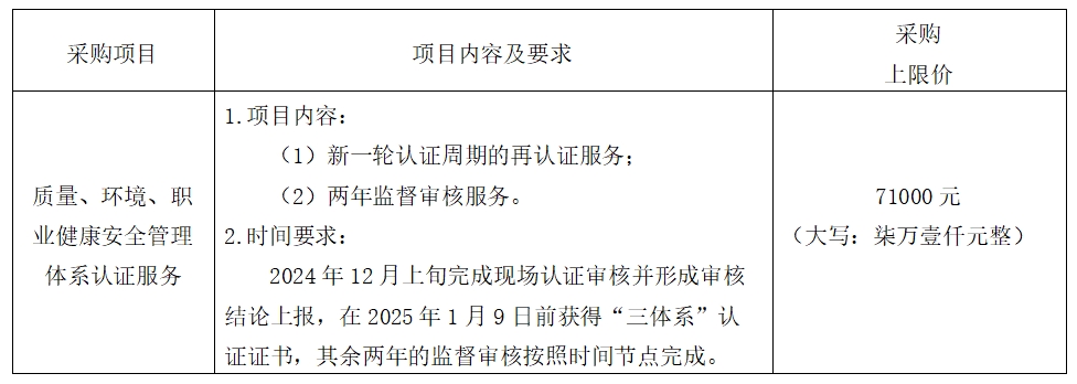 2024年12月上旬完成現(xiàn)場認(rèn)證審核并形成審核結(jié)論上報,在2025年1月9日前獲得“三體系”認(rèn)證證書,其余兩年的監(jiān)督審核按照時間節(jié)點完成。服務(wù)期限內(nèi),如中標(biāo)人未能按照合同條款約定履行合同義務(wù),采購人有權(quán)提前終止合同(具體以簽訂合同為準(zhǔn))。