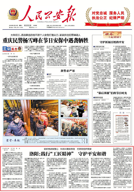 2月26日《人民公安報》頭版刊登了《洛陽:踐行“工匠精神” 守護平安和諧》文章,重點展示洛陽市公安局在“大巡防”工作中,如何做到全市城區(qū)侵財類警情持續(xù)下降。2017年“雙搶”類警情零發(fā)案天數(shù)達到287天。