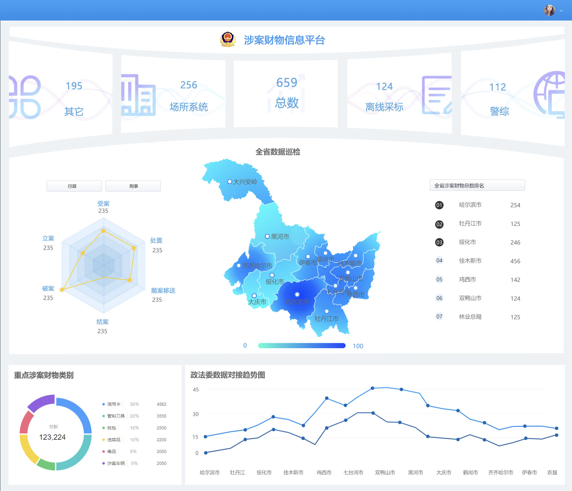黑龍江省涉案財(cái)物管理系統(tǒng),是在中央政法委、黑龍江省委政法委、省公安廳按照《涉案財(cái)物跨部門(mén)集中管理信息平臺(tái)工作方案》建設(shè)的背景下研發(fā)應(yīng)用。實(shí)現(xiàn)全省各地市局涉案財(cái)物數(shù)據(jù)的匯聚和業(yè)務(wù)監(jiān)管,完成涉案財(cái)物跨公檢法數(shù)據(jù)互聯(lián)互通,全流程閉環(huán)管理。
