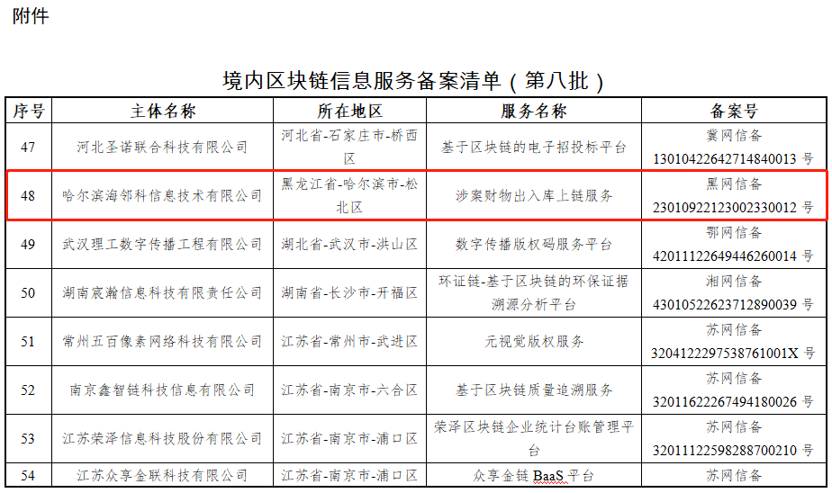 近日,國(guó)家互聯(lián)網(wǎng)信息辦公室關(guān)于發(fā)布第八批境內(nèi)區(qū)塊鏈信息服務(wù)備案編號(hào)的公告,海鄰科區(qū)塊鏈HylinkChain通過(guò)國(guó)家互聯(lián)網(wǎng)信息辦公室備案。這是黑龍江省政法行業(yè)首個(gè)獲備案編號(hào)的區(qū)塊鏈認(rèn)證資質(zhì)。