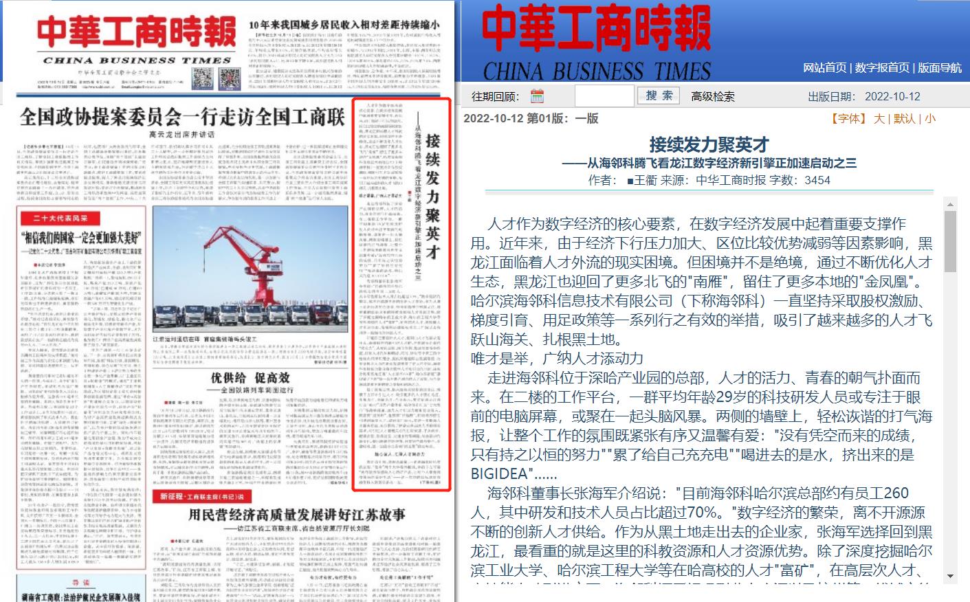 2022年10月12日,《中華工商時報》頭版連載《接續(xù)發(fā)力聚英才——從海鄰科騰飛看龍江數(shù)字經(jīng)濟新引擎正加速啟動之三》,講述海鄰科作為北飛的"南雁",一直堅持采取股權激勵、梯度引育、用足政策等一系列行之有效的舉措,吸引了越來越多的人才飛躍山海關、扎根黑土地。海鄰科已成為引領龍江數(shù)字經(jīng)濟產(chǎn)業(yè)強勁發(fā)展的領頭羊。