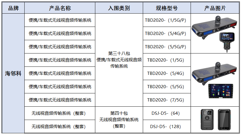 近日,中國政府采購網(wǎng)發(fā)布“公安部警用裝備采購中心警用通信設(shè)備、安全檢查監(jiān)視報警設(shè)備、出入境設(shè)備、網(wǎng)絡(luò)監(jiān)察設(shè)備類協(xié)議供貨補充征集項目成交公告”,海鄰科自主研發(fā)9個型號的智慧警務(wù)執(zhí)法產(chǎn)品成功入圍公安部警用裝備采購中心。
